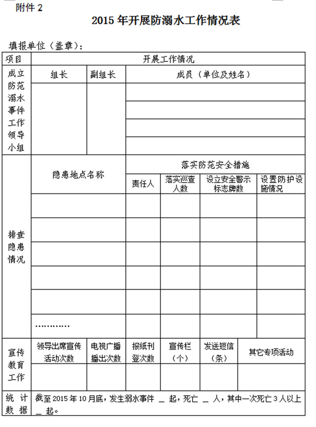 (三)请各区(县)人民政府和市各有关部门于20151031日前将开展防溺水工作总结及《2015年开展防溺水工作情况表》(附件2)书面报送市安委办(联系电话及传真:88992003)。