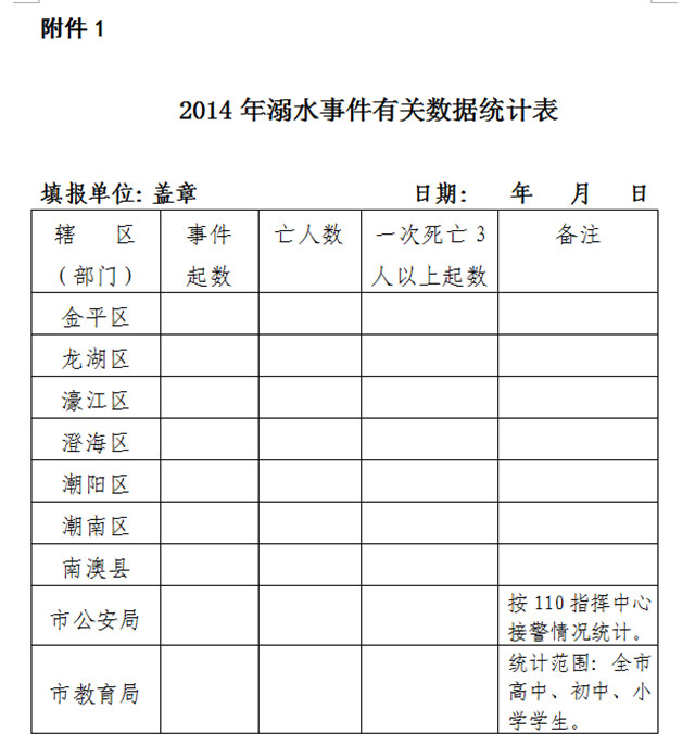 (二)请各区(县)人民政府,市公安、教育局于418日前报送《2014年溺水事件有关数据统计表》(附件1)。