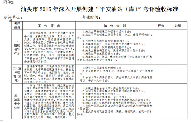 (三)总结验收阶段(2015年12月):各区(县)安监局分析总结平安油站(库)创建情况,查找问题和不足,逐步建立健全油站(库)安全管理长效机制。督促组织试点单位按照创建“平安油站(库)”考评标准进行考评,并报市平安办验收。