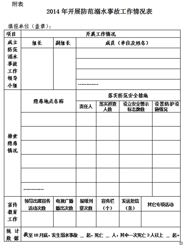 去年以来,各地、各有关部门按照市安委办《关于进一步加强防溺水事故工作的通知》部署要求,高度重视,科学安排,扎实开展防溺水事故工作,取得了一定成效,全市溺水事故得到有效控制。据统计,2013 年全市发生溺水事故61起,死亡71人(其中一次死亡3人以上3起),死亡人数与去年同期相比下降20.22%。但是,溺水事故死亡人数总量还是居高不下,根据全市安全生产第二季度防范较大以上安全事故工作会议精神,市安委办决定从即日起至10月底在全市范围内继续深入开展防溺水事故工作,现将有关事项通知如下: