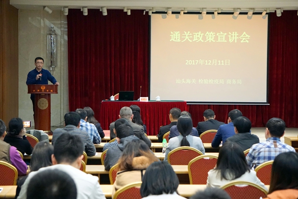 为响应汕头市委市政府的号召,进一步宣传、推进进出口各项业务改革,做好外经贸企业通关业务政策指导,释放红利,惠及企业,促进我市外贸回稳向好,汕头海关、汕头检验检疫局联合汕头市商务局于12月11日下午在汕头市迎宾馆举办了通关政策宣讲会,会议由汕头市商务局副局长赵斌主持,各区(县)商务主管部门有关负责人和130多家外经贸企业代表参加了此次宣讲会。