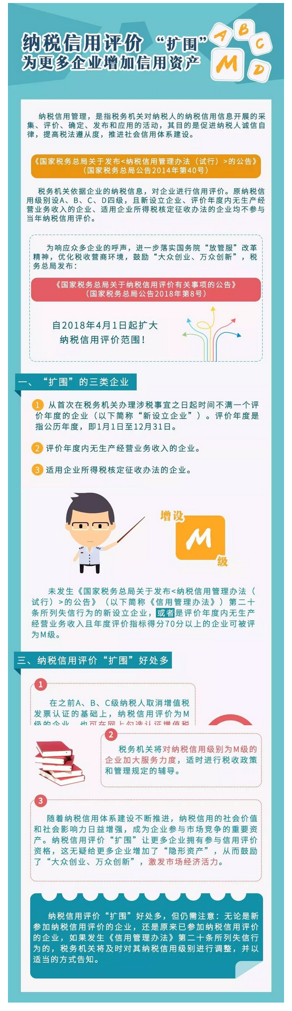 今年,税务部门进一步扩大纳税信用评价范围,将新设立的企业、评价年度内无生产经营业务收入的企业和适用企业所得税核定征收办法的企业纳入评价范围,并且在原有A、B、C、D四级的基础上,增设了M级纳税信用级别。一图了解纳税信用评价“扩围”那些事儿↓