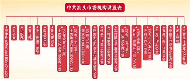 汕头市委设置纪检监察机关1个,计入机构限额的工作机关15个(设在相关部门的市委议事协调机构的办事机构不计入机构限额)。其中,纪律检查委员会与监察委员会合署办公,实行一套工作机构、两个机关名称;办公室挂保密委员会办公室(市国家保密局)、机要局(市密码管理局)、市档案局牌子;组织部挂市公务员局牌子;宣传部挂市精神文明建设委员会办公室、市新闻出版局(版权局)牌子;统一战线工作部挂市民族宗教事务局、市港澳事务局、市侨务局牌子;网络安全和信息化委员会办公室挂市互联网信息办公室牌子;军民融合发展委员会办公室挂市人民防空办公室牌子;台湾工作办公室挂市台湾事务局牌子。