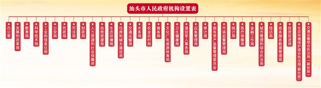 汕头市人民政府设置工作部门33个。其中,发展和改革局挂粮食和物资储备局牌子;自然资源局挂海洋局牌子;农业农村局挂扶贫开发办公室牌子;商务局挂口岸局牌子;文化广电旅游体育局挂文物局牌子;卫生健康局挂中医药局牌子;市场监督管理局挂知识产权局牌子。外事局与市委外事工作委员会办公室合署办公,不计入机构限额;民族宗教事务局列入政府工作部门序列,不计入机构限额。