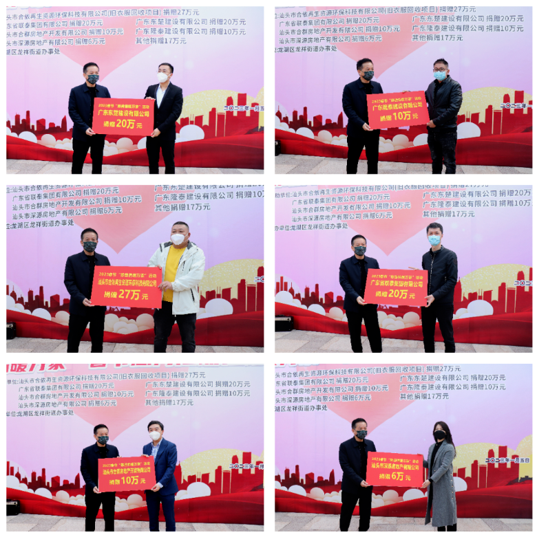 作为一年一度的慈善盛事,本次活动得到了汕头市合依再生资源环保科技有限公司、广东省联泰集团有限公司、广东东楚建设有限公司、广东隆泰建设有限公司、汕头市合群房地产开发有限公司、汕头市深源房地产有限公司等6家爱心企业的支持,共筹集善款110万元,购买大米20万斤,食用油5万升,共计1万份。市慈善总会会长陈镇坤同志接受爱心企业捐赠并回赠纪念牌匾。 市政府副秘书长林健同志在致辞中向爱心企业表示感谢,希望通过组织开展“慈善情暖万家”春节慰问公益活动,传递和落实党委、政府的关爱之情,弘扬慈善理念,营造慈善氛围,动员更多的企业、个人参与慈善事业,进一步推动慈善事业与社会救助工作融合发展。活动现场,各级领导及爱心捐赠企业代表还向困难群众发放慰问物资。