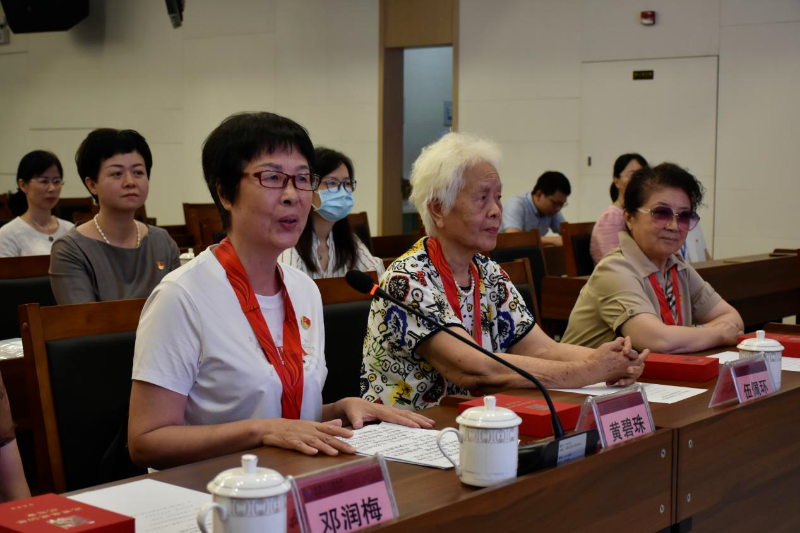 宣誓活动结束后,紧接在医院会议室召开“光荣在党50年”纪念章集中颁发仪式及党员代表座谈会。包括94岁的陈国华老人在内的6位老党员代表被授予“光荣在党50年”纪念章。“虽然我们已是退休了,人老了,但岁月更坚定了我们听党的话,永远跟党走”,老党员黄碧珠道出了在场老党员的共同心声。会议还宣读了市委卫生健康工委优秀共产党员、优秀党务工作者及先进基层党组织表彰决定。