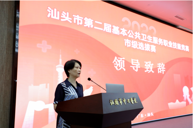 唐轶玲在比赛现场上致辞,她首先代表市卫生健康局向参加本次选拔赛的各位领导、各位评委和参赛队员表示热烈的欢迎和诚挚的慰问,希望通过本次竞赛全方位提高全市基层医疗卫生工作者的理论与实践能力水平,展现卫生健康系统敬佑生命、勤奋学习、爱岗敬业、积极向上的精神风貌,为全市广大城乡居民的健康保驾护航。同时,希望通过此次竞赛选拔出5名优胜选手代表汕头市参加省级决赛,取得更高荣誉。