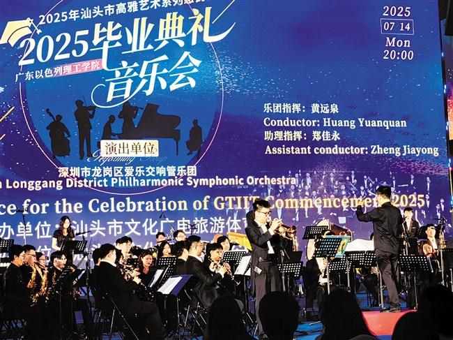 7月14日晚,“2025年汕头市高雅艺术系列惠民演出暨广东以色列理工学院2025毕业典礼音乐会”在广以南校区精彩上演。音乐会在气势如虹的《肖斯塔科维奇第五交响曲》第四乐章的旋律中拉开帷幕,深圳市龙岗区爱乐交响管乐团以精湛的技艺,演绎了一系列经典曲目。这场特别的毕业典礼音乐会不仅是对广以2025届毕业生的深情祝福,更是高雅艺术走进高校、惠及民众的生动实践,点燃毕业季的热烈氛围。
