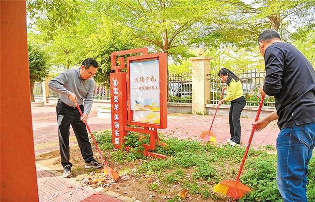 (龙湖区龙祥街道泰龙社区干部职工和志愿者齐心协力清理绿化带垃圾杂物。 记者林鹏 摄)