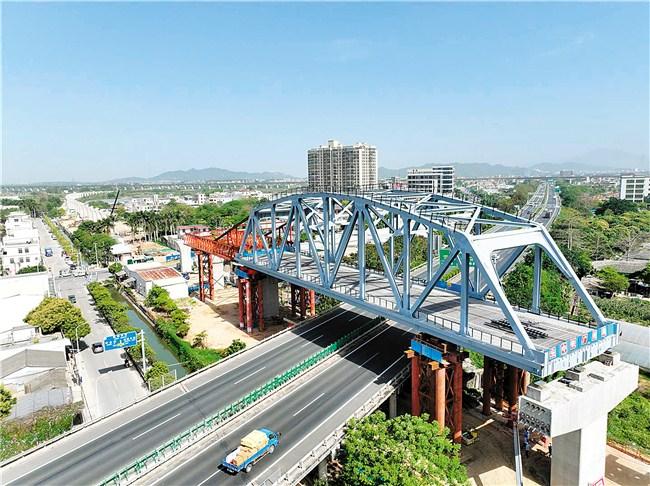 (跨沈海高速钢桁梁顺利完成顶推。 记者许远志 摄)