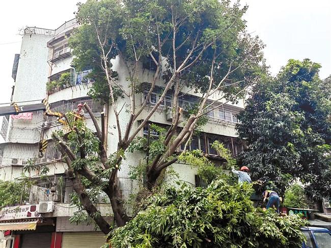 (城管部门对高风险树木实施修剪减负。 记者 蔡晓丹 摄)