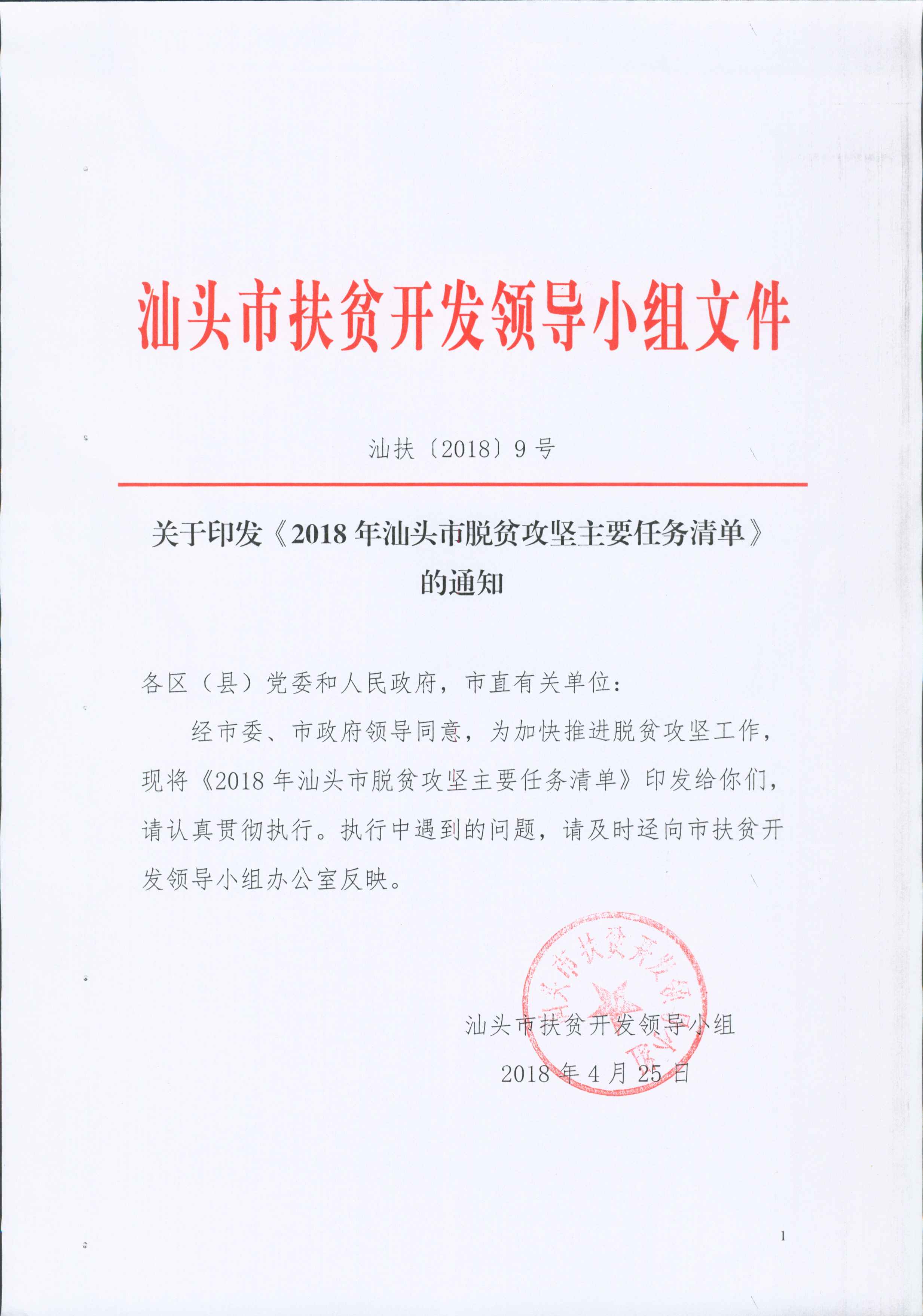 关于印发《2018年汕头市脱贫攻坚主要任务清单》的通知