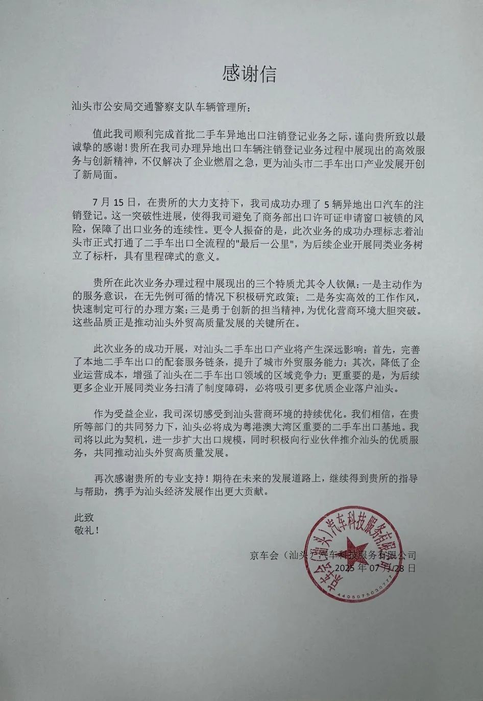 近日,来自一家汽车服务企业汕头分公司的一封感谢信,送到了汕头市公安局交管支队车管所: “贵所在办理二手车异地出口注销登记业务过程中,展现出的高效服务与创新精神,不仅解决了企业燃眉之急,更为汕头市二手车出口产业发展打通了‘最后一公里’,具有里程碑式意义。” 字里行间,既是真情流露,更是对汕头优化营商环境成效的充分肯定。这场企业与车管所之间的“双向奔赴”,是我市优化营商环境的一次生动实践。 这不是一次简单的业务办理,更是在粤东地区率先探索的创新尝试。根据《机动车登记规定》(公安部令第164号)、《商务部等五部门关于二手车出口有关事项的公告》等相关规定,面对企业办理出口业务遇到的紧迫诉求,汕头市公安局交管支队车管所主动对接企业,打通关键节点,现场直接为5辆异地车辆完成出口注销登记,让企业无需再来回奔波,有效节省时间与成本,真正把暖心服务送到企业手中。 把窗口做成桥梁,把服务做进心里 近年来,汕头市公安局交管支队车管所认真贯彻市委、市政府关于打造一流营商环境的决策部署,始终聚焦企业和群众“急难愁盼”问题,积极拓展便民利企服务举措,陆续推出“周六办”“延时办”“上门办”“就近办”“网上办”等服务模式,不断提升交管服务质效,增强企业、群众的满意度与获得感。 自涉企服务窗口设立以来,汕头市公安局交管支队车管所始终坚持“一次告知、即来即办、办就办好”的服务理念,已累计为856家企业办理业务10279笔,服务范围持续拓展,影响力不断提升,赢得企业和社会广泛好评。 服务不是喊口号,优化环境贵在“落地” 在汕头市公安局交管支队车管所服务大厅,群众感受到的是专业与效率,企业感受到的是温暖与尊重。“您好,我来办业务。”一声简单问候,始终得到热情回应,点滴细节之间,体现的是交管窗口工作人员的用心用情。近年来,汕头市公安局交管支队车管所从细处着手,从实处发力,不断优化办理流程,完善配套服务,推动涉企服务提质升级。一个流程能否优化?一个企业能不能少跑一次?这些看似细微的小改变,正是营商环境“好不好、实不实”的关键体现。 涉企服务窗口 下一步,汕头市公安局将持续深化交管“放管服”改革举措,进一步推进服务型窗口建设,把优化营商环境的要求落实到每一笔业务、每一个流程、每一位群众身上,用专业、效率和温度实现“营商环境看得见、感受得到、信得过”的承诺。