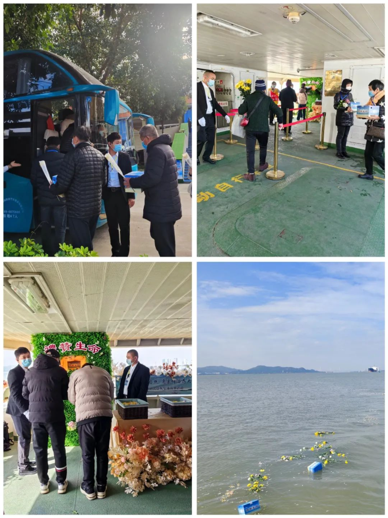 碧波荡漾,惠风和畅。随着一声长笛,上午10:30许,海葬船只行至海葬点,带着深情和不舍,家属们依次手捧先人安乐盒送上“生命礼赞门”,伴着鲜花和海风,缓缓沉入大海,至此长眠于海。海葬仪式持续半个多小时,在仪式结束后返程途中,家属纷纷在感言录上留下对亲人的无限思念和对未来的美好期许。