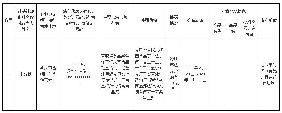 汕头市澄海区食品药品监督管理局“黑名单”信息公开表