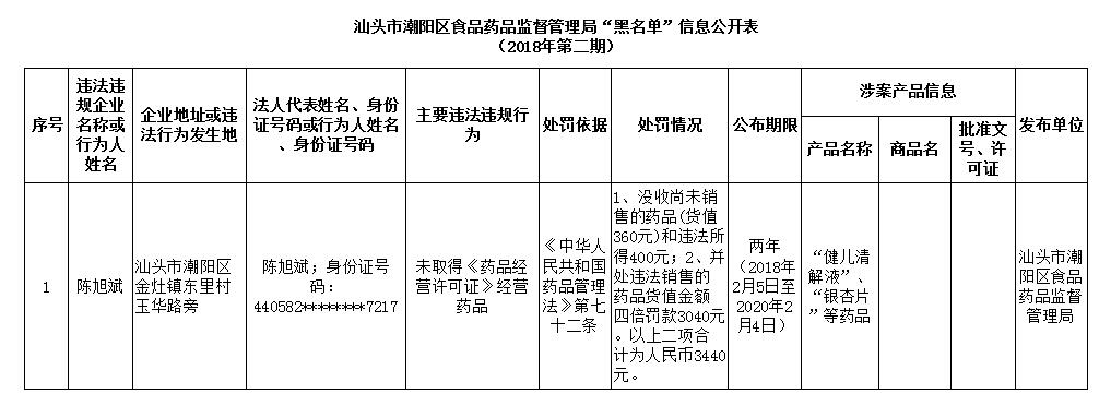 汕头市潮阳区食品药品监督管理局“黑名单”信息公开表(2018年第二期)