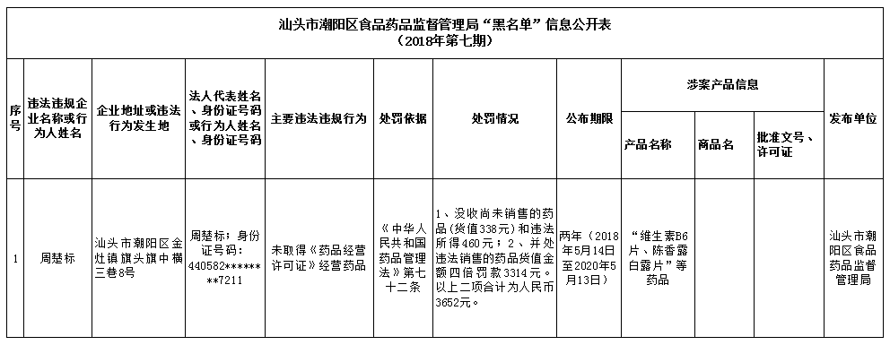 汕头市潮阳区食品药品监督管理局“黑名单”信息公开表(2018年第七期)