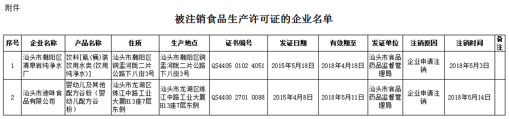 根据《中华人民共和国行政许可法》和《工业产品生产许可证注销程序管理规定》,我局决定注销汕头市潮阳区清泉岩纯净水厂和汕头市迪味食品有限公司的食品生产许可证(名单见附件)。