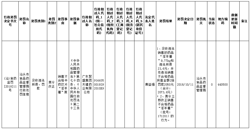 汕头市食品药品监督管理局行政处罚信息(汕)食药监罚[2018]11号