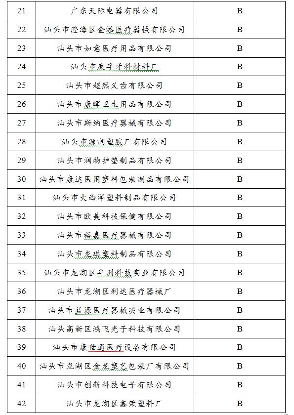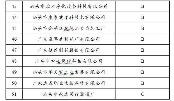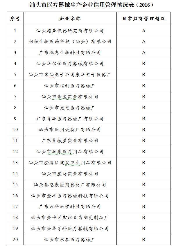 根据《广东省医疗器械生产企业质量信用分类监管工作的意见》(粤食药监械〔2011110号)的有关规定,现将汕头市2016年度医疗器械生产企业质量信用评级名单予以公布: