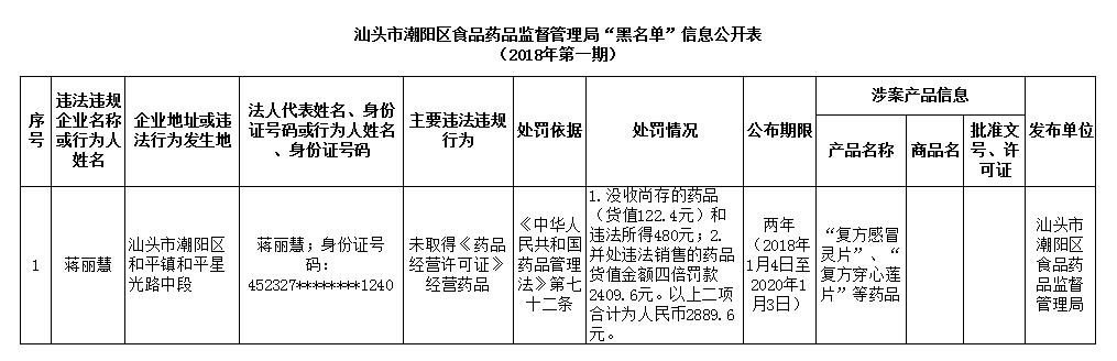 汕头市潮阳区食品药品监督管理局“黑名单”信息公开表(2018年第一期)