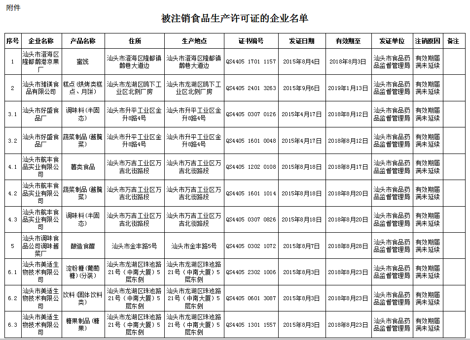 根据《中华人民共和国行政许可法》和《食品生产许可管理办法》(国家食品药品监督管理总局令第16号)的有关规定,我局决定注销汕头市澄海区隆都鹊港凉果厂等6家的11张食品生产许可证(名单见附件)。