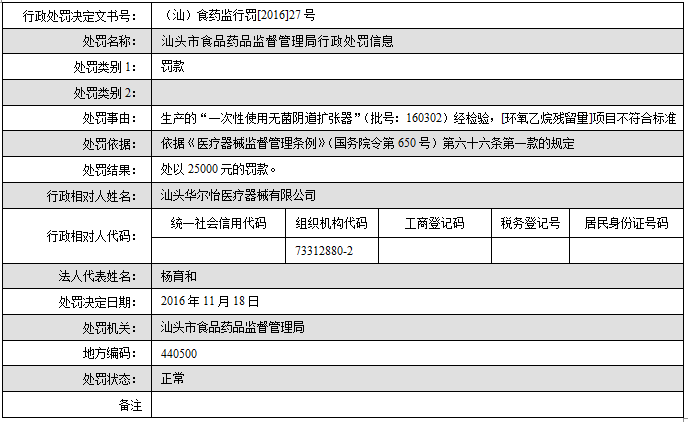 汕头市食品药品监督管理局行政处罚信息(汕)食药监罚[2016]27号