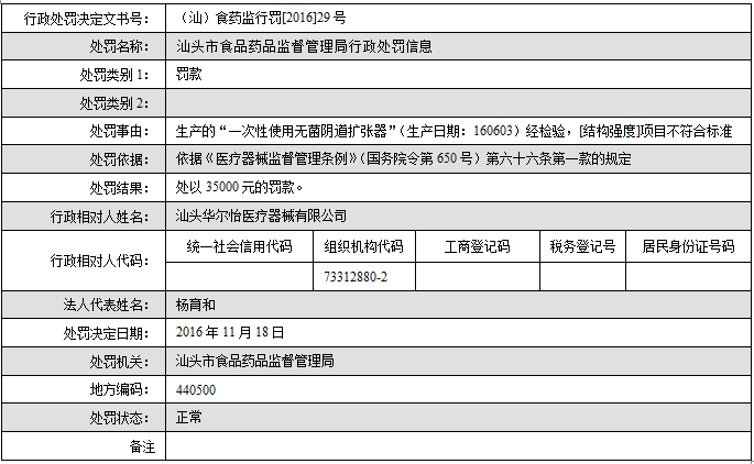 汕头市食品药品监督管理局行政处罚信息(汕)食药监罚[2016]29号