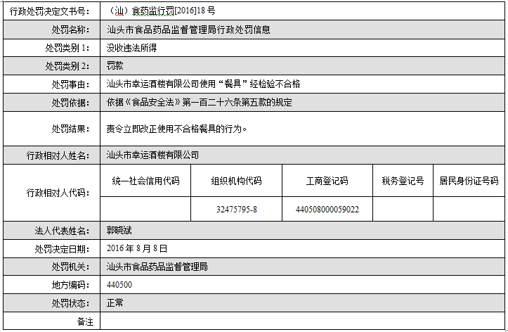 汕头市食品药品监督管理局行政处罚信息(汕)食药监罚[2016]18号