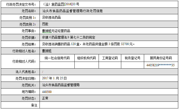 汕头市食品药品监督管理局行政处罚信息(汕)食药监罚[2016]33号