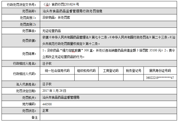 汕头市食品药品监督管理局行政处罚信息(汕)食药监罚[2016]34号