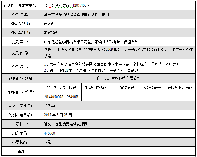 汕头市食品药品监督管理局行政处罚信息(汕)食药监罚[2017]03号