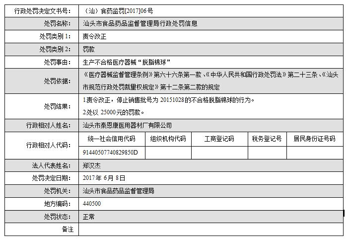 汕头市食品药品监督管理局行政处罚信息(汕)食药监罚[2017]06号