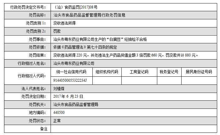 汕头市食品药品监督管理局行政处罚信息(汕)食药监罚[2017]08号