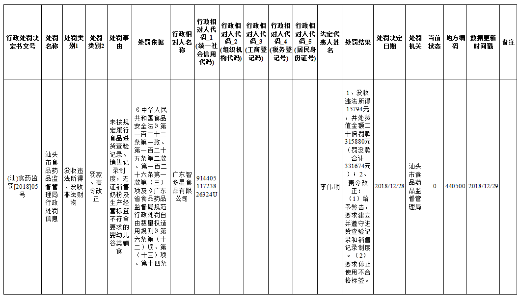 汕头市食品药品监督管理局行政处罚信息(汕)食药监罚[2018]05号