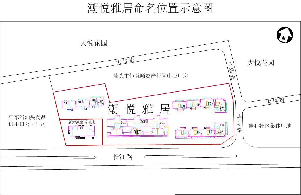 位于龙湖区长江路北侧,由汕头市信基房地产开发有限公司、广东省汕头丝绸进出口有限公司、龙湖区新津街道南碧埠经济联合社联合开发建设的“三旧”改造项目商住小区。范围东至大悦街、规划路毗邻佳和社区集体用地,西至广东省汕头食品进出口公司厂房、新津派出所用地,南至新津派出所用地、长江路,北至汕头市恒益顺资产托管中心厂房。用地面积18075.2平方米,建设4栋建筑物,其中17层建筑物2栋、18层建筑物1栋、20层建筑物1栋,总建筑面积101331.65平方米。根据地名管理有关规定,同意命名为潮悦雅居 Cháoyuè Yǎjū (附命名位置示意图)。