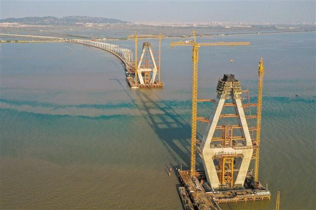 据了解,主塔采用了先进的施工工艺,在承台上安装液压爬模,一节一节地往上“爬”,该工艺保证了高空作业的安全性,也方便上下层建设工序的互联,进一步提高施工效率。随着中塔柱的合龙,大桥将继续进行主塔的爬升施工。