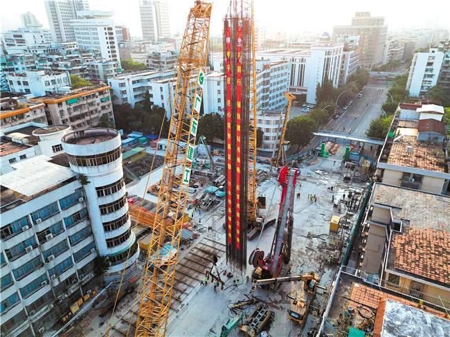 据介绍,汕头一中站地下连续墙施工区域地质条件复杂,地层软硬不均、岩层起伏不一,且周围邻近建筑物荷载较大,成槽风险极高。为此,项目部以“旋、抓、铣、冲”相结合的方式进行成槽施工,过程严格把控泥浆质量、成槽速度及垂直度;采用新型钢筋连接形式——轴向冷挤压套筒连接,替代传统的钢筋焊接连接,提高质量可控性和施工安全性;地下连续墙进行分节吊装,采用南北幅倒边做法,将钢筋笼对接安装由原来的5小时/笼缩短至2.5小时/笼,显著提升施工效率。