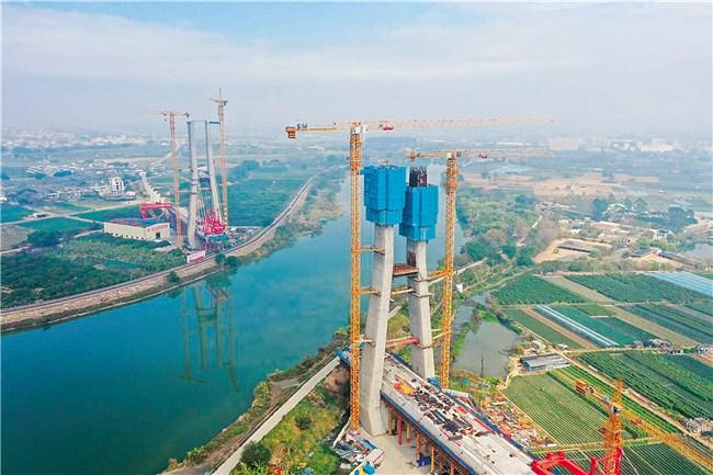 作为粤东城际铁路的重要节点工程之一,跨南溪河斜拉桥的建设也在紧锣密鼓地进行中。该斜拉桥主桥全长510米,设计为双塔双索面半漂浮体系钢混组合梁斜拉桥,桥塔采用钢筋混凝土双柱式钻石塔,目前北岸主塔已顺利封顶,两岸边跨现浇梁已全部完成,工人们正加紧进行中跨钢梁架设和南岸主塔的施工。“135号主塔于去年12月底完成封顶,136号主塔预计今年3月底封顶。目前100多名工人全力推进工程建设,力争8月底实现全桥合龙。”南溪河斜拉桥生产负责人高健说。