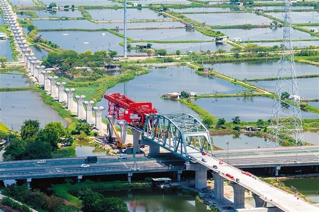 (架桥机成功跨越潮汕环线高速,打通粤东城际铁路汕头段与揭阳段架梁通道。)