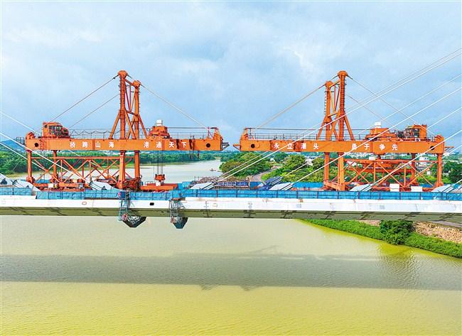 据中铁广州工程局集团粤东城际项目一分部负责人饶康飞介绍,大桥主梁架设采用了自主研发的塔柱式架桥机,创新设计的旋转吊具可实现后方喂梁,无需设置提升站即可完成大吨位钢梁吊装,成功解决了南溪河船闸不具备开通条件以及无法水上运输钢梁的问题,配套采用的液压、智能操作系统,实现了桥机平稳快速前移,在确保钢梁顺利吊装的同时,有效缩短了施工周期。