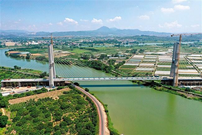 (粤东城际铁路跨南溪河大桥正在进行桥面施工。)