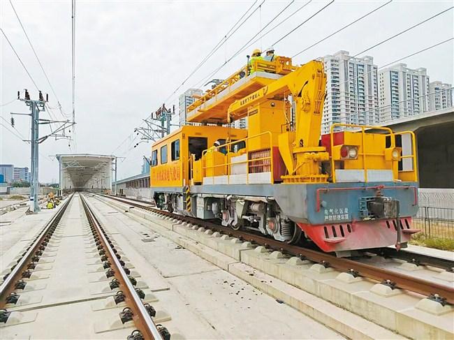 (接触网冷滑试验车从汕头站驶出。)