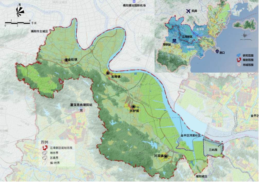 本规划范围包括汕头市潮阳区金灶镇、关埠镇、西胪镇、河溪镇四个建制镇以及金平区东方街道浔洄社区、三屿围片区(含濠江区部分区域)。规划面积约 331平方公里,其中核心区约58平方公里,起步区约24平方公里。规划期近期至2025年,中期至2035年,远期展望至2050年。