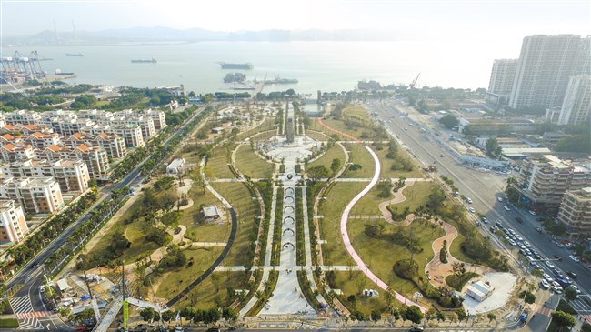 整个园区的设计以周边居住用地带来的成熟的开发条件,结合南面大面积的海域,保留现状地形和景观,结合标识性意义的构筑物,采用清晰的主轴园林设计,其中以贯穿南北400米主干道为纵向中轴线,在中轴线两侧分布着两条对称的塑胶休闲散步道。“沿着中轴线从北往南,依次是六道铁艺式拱门、“一眼望天下”主题雕像以及规模为1200平方米的音乐旱喷广场和中央景观钟楼。”施工方告诉记者,在南区中轴线主干道东侧,还分别设置有“大小金凤花”雕塑两座,而在西侧,则有滨水休闲平台。同时,利用大片草坪和绿色隧道,以银海枣、香樟、秋枫、南洋楹等乔木为主,配置其它开花植物,形成独有的文化景点,打造以生态环境为核心的精品城市绿地。