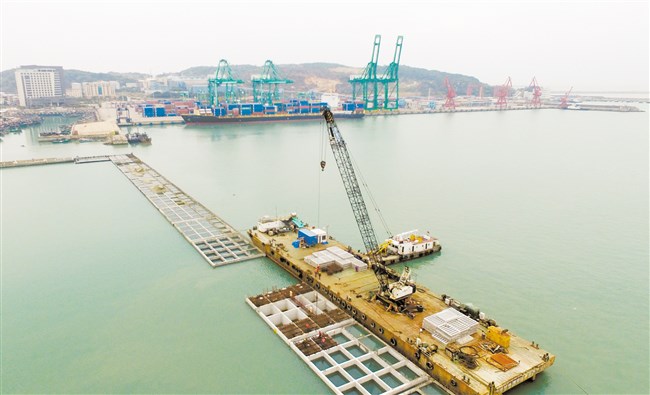先期安装到位的沉箱已经形成了一条整齐的岸线,大型施工船舶正在安装最后一个沉箱。广澳港区二期工程共有两个十万吨级集装箱泊位,码头结构设计需要58件大型沉箱。每件沉箱与一座6层高的楼房差不多,重达2848吨。在陆地上预制完成后,先行拖带到施工水域存放。在开始安装施工时,需要由施工人员先对存放在海中的沉箱抽水,减轻其重量让其上浮,然后由专业的驳船拖带到指定位置,重新注水让沉箱慢慢下沉到水下,并在沉箱基床上固定安放。