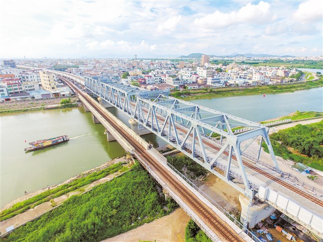 在厦深铁路联络线关键性节点梅溪河特大桥,旁边的既有广梅汕铁路上,一列绿皮火车正呼啸着通过。相隔雄伟的钢桁梁结构的梅溪河特大桥的雄姿已展现出来,静待着通车之日通往汕头中心城区的白色动车。