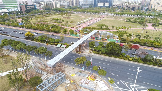 “本座天桥将在主桥加装圆弧形雨棚,两端配套直升电梯,不仅可以遮风挡雨,而且市民通行十分便利,也是我市首条有配套直升电梯的天桥。”施工方表示,天桥由上海同济建筑设计院设计,汕头海悦度假村有限公司捐资建设,除了装设电梯外,还将在桥体外围配套景观灯饰,与时代广场周边的灯光连成一体,届时将成为时代广场周边又一道靓丽的风景线。“我们将继续加紧施工,力争今年春节前与华侨公园西侧绿地同步开放。”