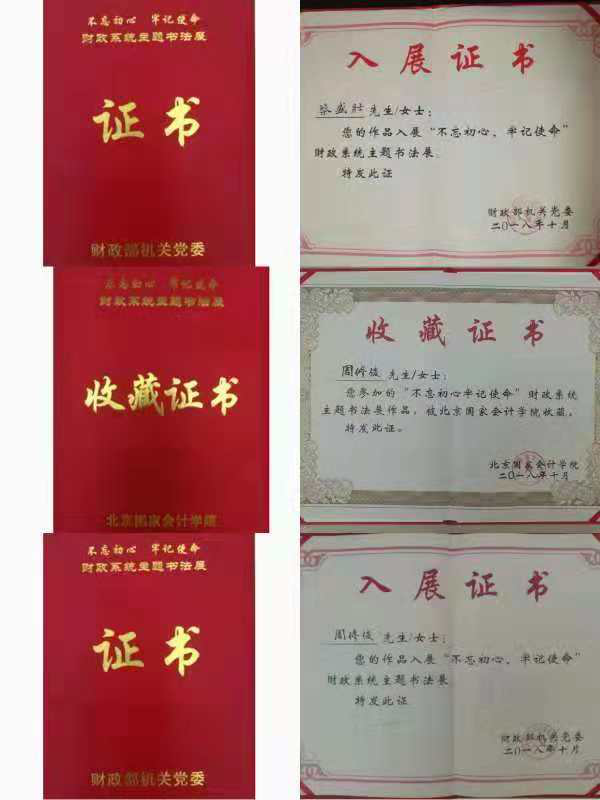 为深入学习宣传贯彻习近平新时代中国特色社会主义思想和党的十九大精神,热烈响应财政部机关党委,关于积极参加财政部机关党委与国家会计学院联合于今年7月开始,在北京举办全国财政系统“不忘初心、牢记使命”主题书法展览的号召,以实际行动弘扬社会主义核心价值观,推动精神文明建设。局精心组织党员干部职工、离退休人员参加活动,局教科文科蔡盛壮以为爱党名言警句的端庄秀丽的楷书条幅,原下属金源公司周修俊书写的朱子家训的高雅浑厚的隶书条幅,与省财政系统14名参展人员作品,一同入选本次财政部机关党委、国家会计学院财全国财政系统书法展览,周修俊参展作品,被国家会计学院永久收藏,二位入展同志获受财政部机关党委证书。