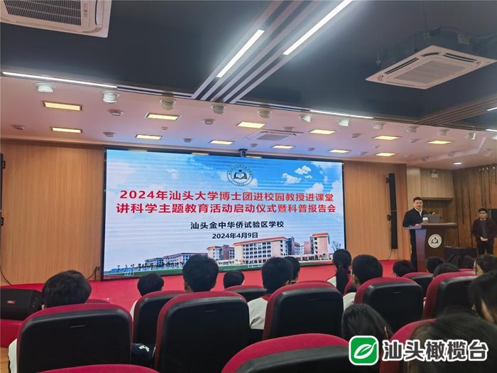 4月9日,由汕头市教育局主办、汕头市教师发展中心承办的2024年汕头大学博士团进校园教授进课堂讲科学主题教育活动启动仪式暨科普报告会在汕头金中华侨试验区学校举行。据悉,本次活动为期一个月,汕头大学的资深教授、博士将走进我市中小学校园,为我市中小学师生作20场科普报告。